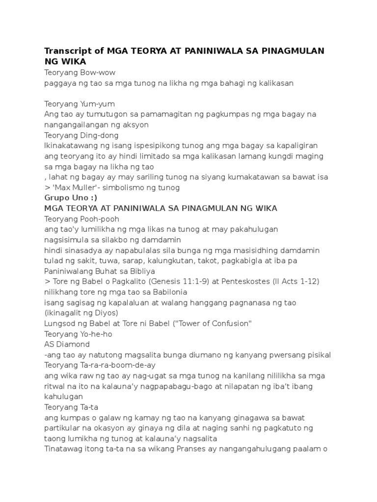 Transcript Of Mga Teorya At Paniniwala Sa Pinagmulan Ng Wika Pdf