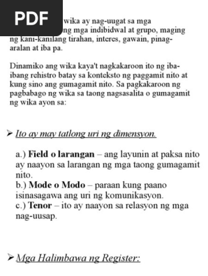 Ang mga halimbawa sa ibat-ibang larangan. Register ng Wika - Ito ay tawag sa mga espesyalisadong termino gaya ng mga salitang siyentipiko o teknikal na nagtataglay ng ibat ibang kahulugan sa ibat ibang larangan o disiplina Barayti ng Wika - Ito ay ang pagkakaroon ng natatanging katangian na nauugnay sa partikular na uri ng katangiang sosyo-sitwasyonal Permanente - Ito ang uri ng wika na para sa mga tagapagsalita. Ang mga katangian ng mga teksto ay brainly.