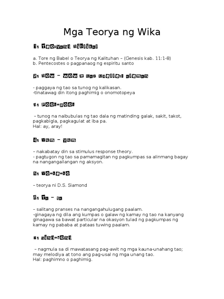 Ngunit maraming mga hayop ang gumagawa ng mga ganitong uri ng tunog din at hindi sila napunta sa wika. Ang wika ay nanggaling mula sa tunog na nalilikha ng mga bagay na nakapaligid sa atin TararaboomTararaboom-deay Ang. Nailalahad sa pamamagitan ng pagpapaliwanag ang bawat teorya ng wika.